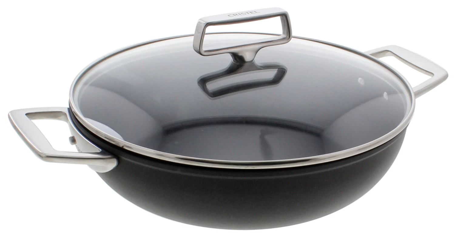 Het Franse topmerk Cristel ontwikkelde de lijn Castel’Pro voor gebruik in de professionele keuken zowel als thuis. Deze pannen zijn opgebouwd uit vijf verschillende lagen. Aan de buitenzijde zit een laag 18/0 edelstaal, gevolgd door een laag aluminium, een laag versterkt aluminium, een laag aluminium en aan de binnenzijde een laag 18/10 edelstaal. De pan heeft een dichtgelegde gietrand, waardoor de pan vaatwasmachinebestendig is. De gegoten roestvrijstalen grepen en stelen zitten met roestvrijstalen nagels aan de pan vast en geleiden weinig warmte. Door het gebruik van 18/0 staal zijn Castel’Pro pannen zowel geschikt voor alle warmtebronnen en om in de oven te gebruiken.