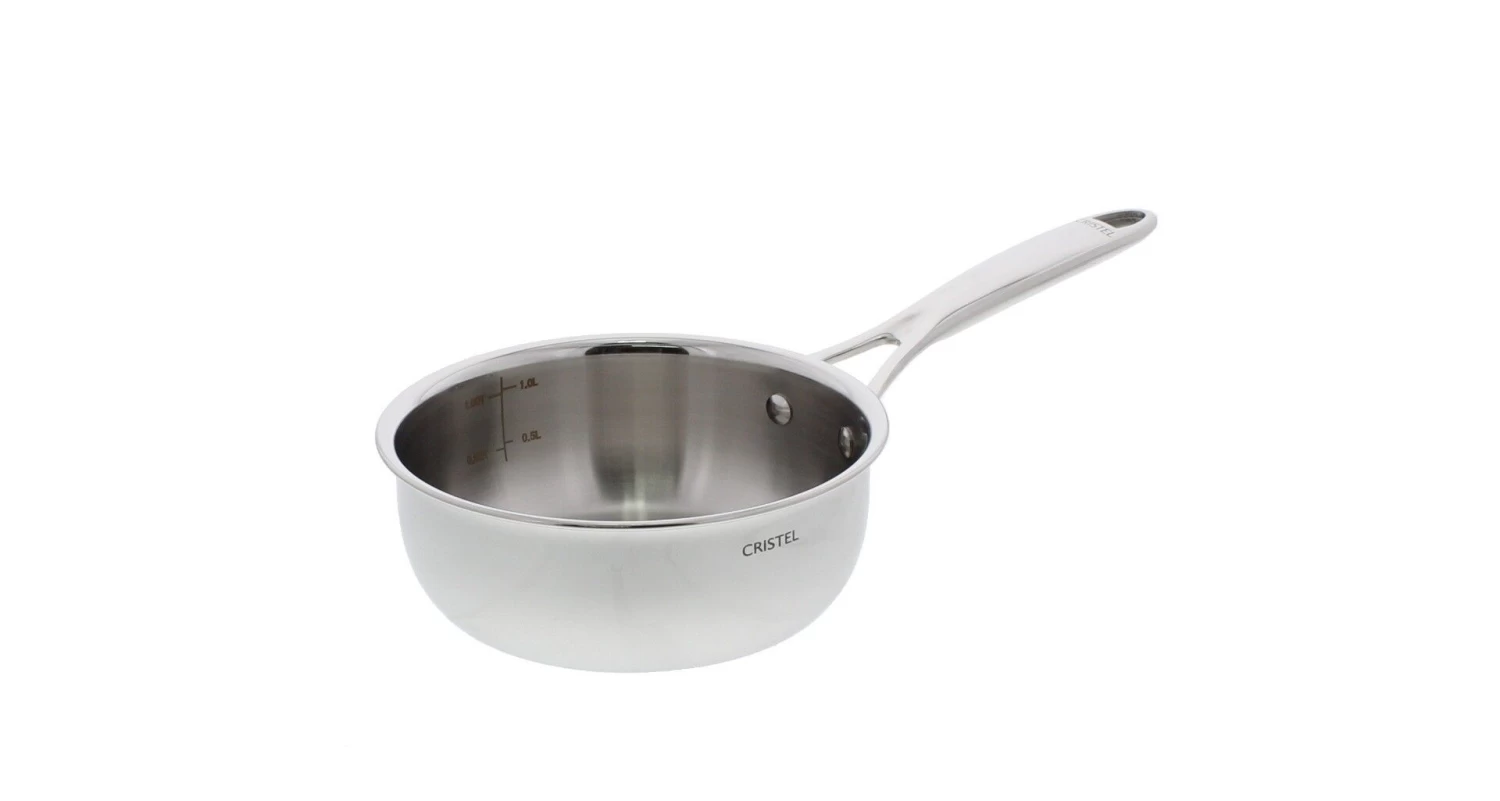 De Cristel Castel’Pro sauspan heeft een diameter van 16 cm en is gemaakt van roestvrij staal en is opgebouwd uit 5 verschillende lagen. De pan heeft een inhoud van 1,2 liter en is 6,4 cm hoog. Door de geronde wanden is het gemakkelijk om met een garde of lepel in de pan te roeren bij het bereiden van sauzen of kleine gerechten. De gebogen schenkrand maakt het mogelijk om de inhoud zonder druppelen uit te schenken. Gebruik de sauspan op elke warmtebron of om het gerecht te garen in de oven.
