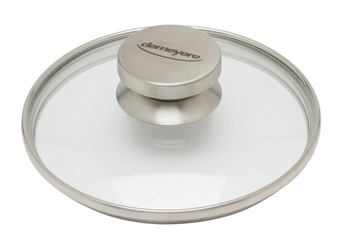 De glazen deksel van Demeyere is gemaakt van zeer sterk gehard glas met een roestvrijstalen knop en rand.
