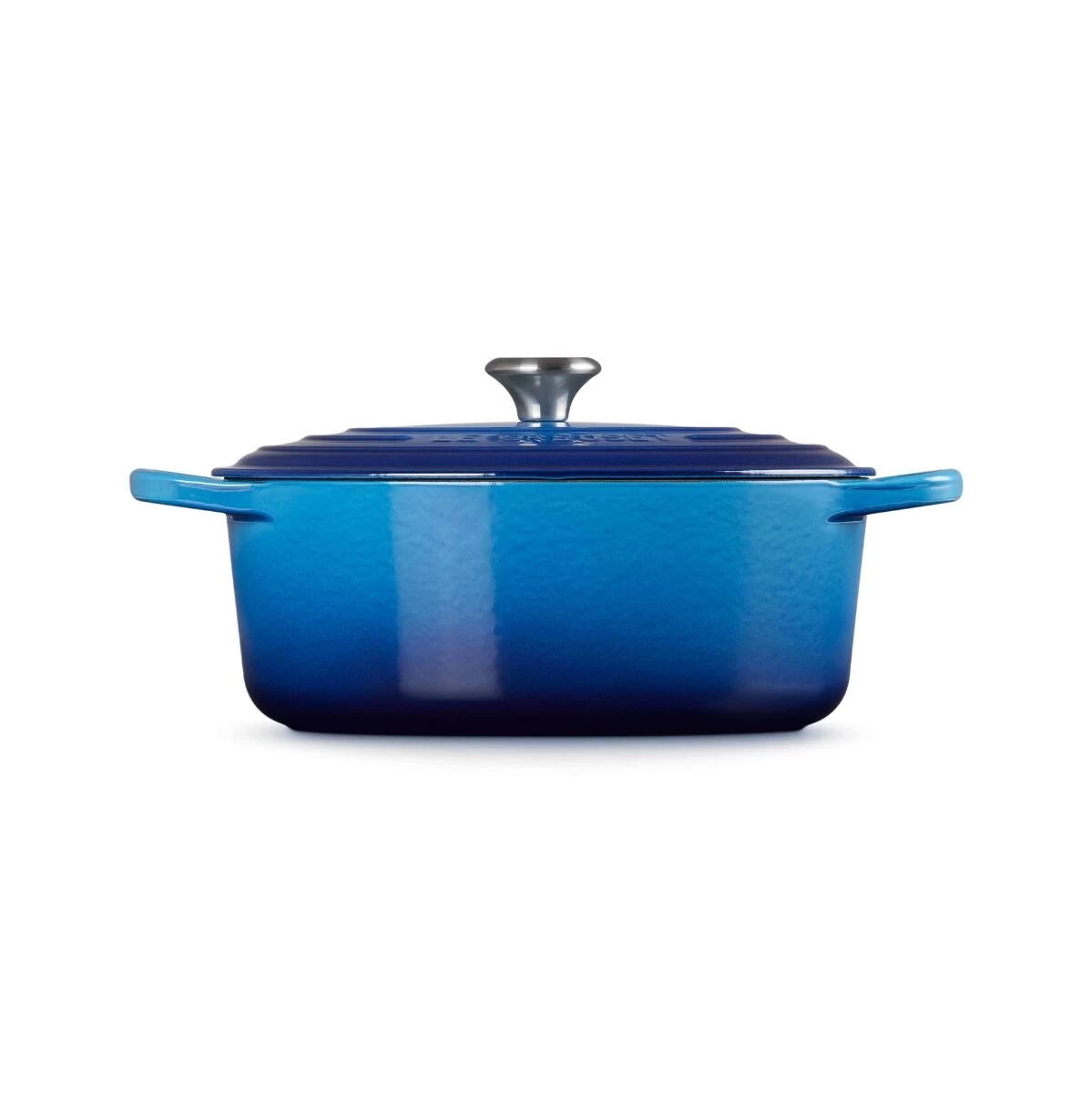 De Signature ovale braadpan van Le Creuset in de kleur Azure heeft een lengte van 33 cm. De ronde pan van geëmailleerd gietijzer heeft een inhoud van 1,8 liter. De braad-/ stoofpan heeft extra grote grepen. De ronde vorm maakt de Signature braadpan geschikt voor soep en stoofgerechten als boeuf bourguignon.